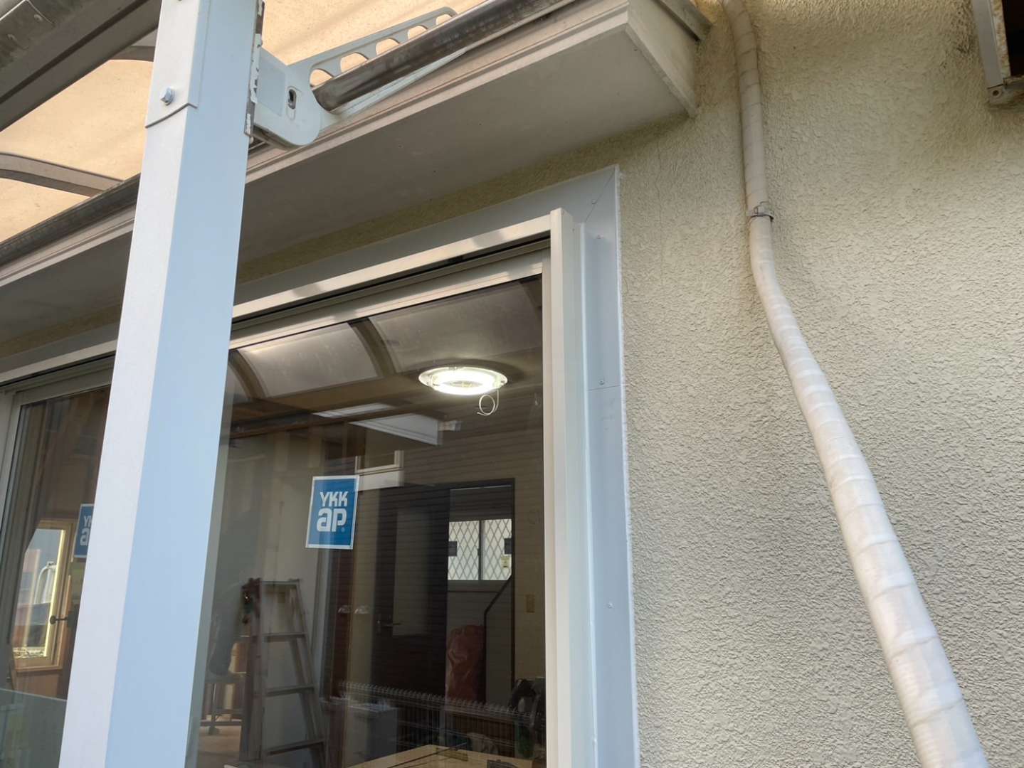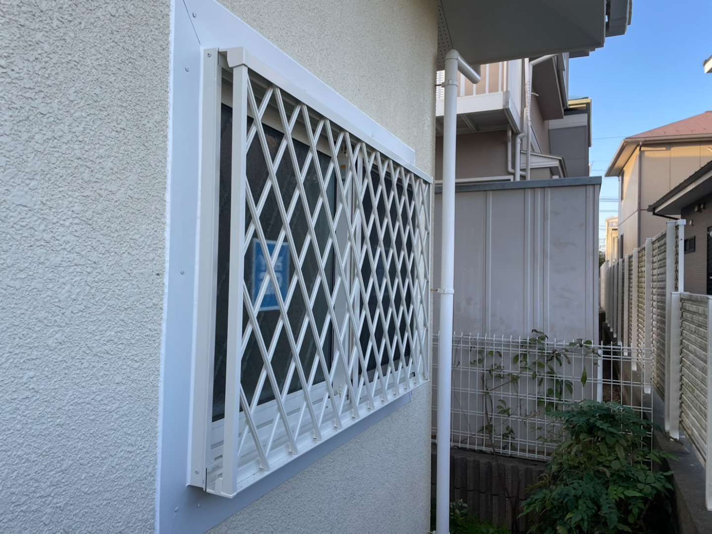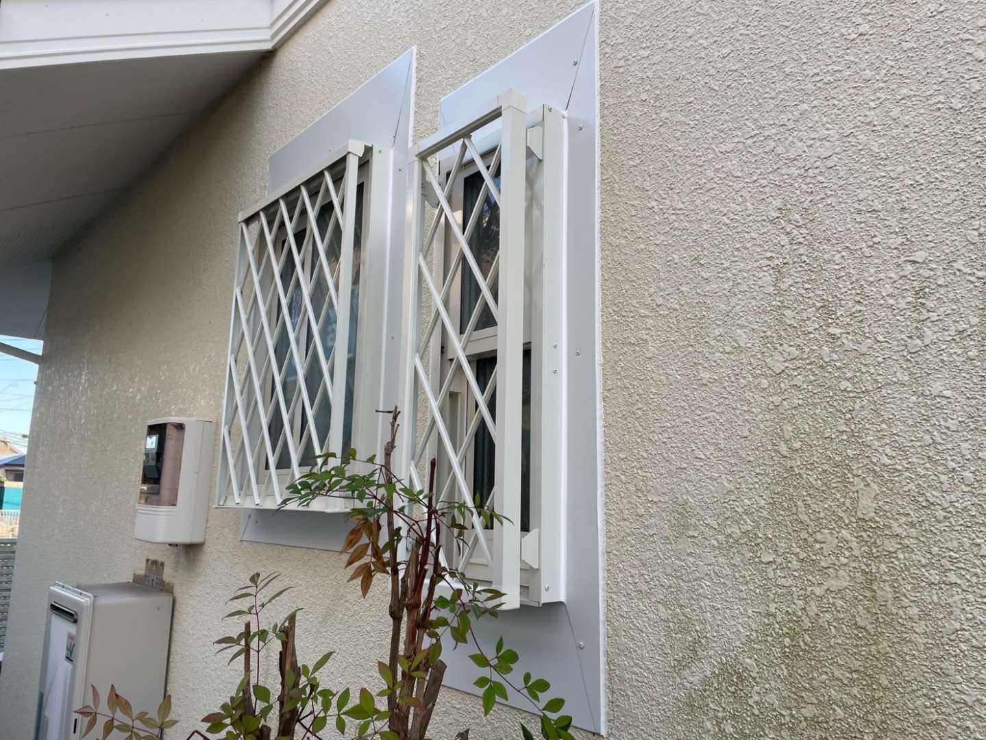 ●今回の工事では、掃き出し窓・縦すべり出し窓など複数箇所に対し、白を基調としたアルミ製の格子と庇を設置しました。面格子は可動式のため、日常の採光や通風を妨げず、防犯性をしっかり確保できます。また、窓まわりには板金による水切り・笠木処理を丁寧に施し、雨仕舞いの精度も向上させました。