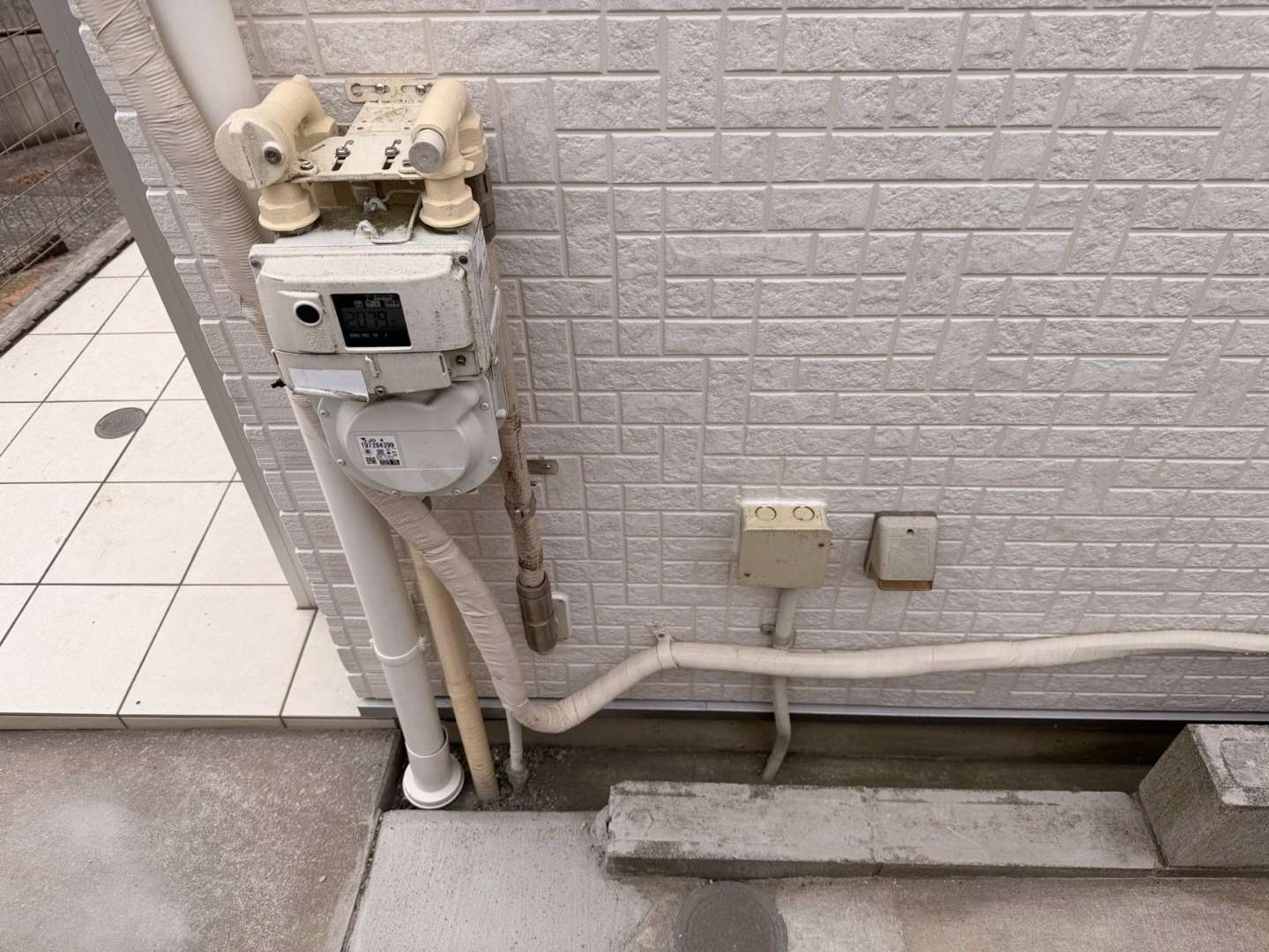 施工前の玄関周りの外壁は、長年の紫外線や雨風の影響により、以下のような劣化サインが見られました。